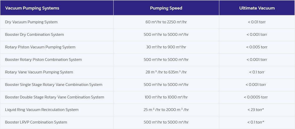 Tekman offers Dry, Rotary Piston, Rotary Vane, and Liquid Ring vacuum pumping systems, with single or double booster configurations and process-specific accessories.